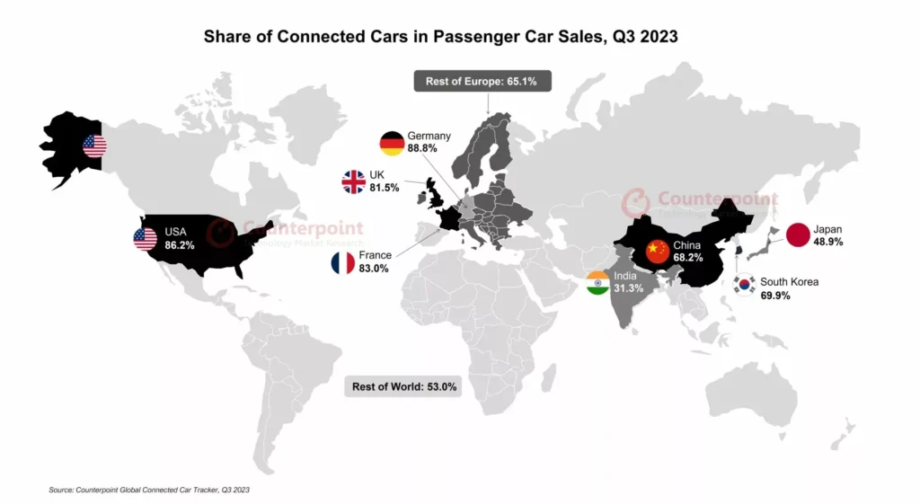 Global connected car sales grew 28% year-on-year in the third quarter of 2023, according to the latest research from Counterpoint’s Global Connected Car Sales Tracker. It says every two out of three cars sold in during the quarter had embedded connectivity in them. China led with around 33% share in global connected car sales, followed by the […]