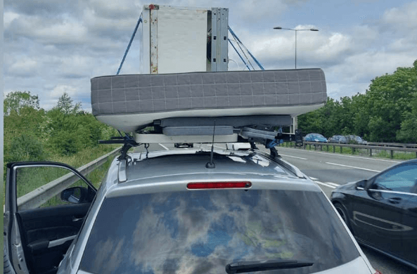 Car carrying mattress and fridge on its roof stopped on M11