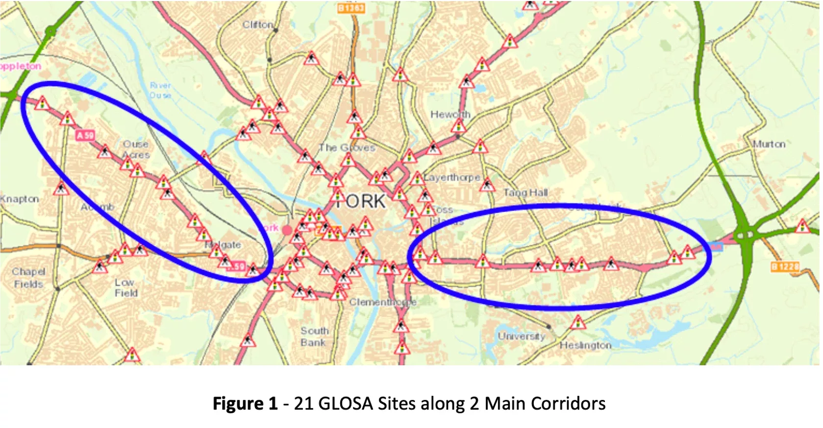 A total of 22 locations were chosen in 2 main corridors leading into and out of the city, along the A59 and the A1079 as seen in Figure 1.