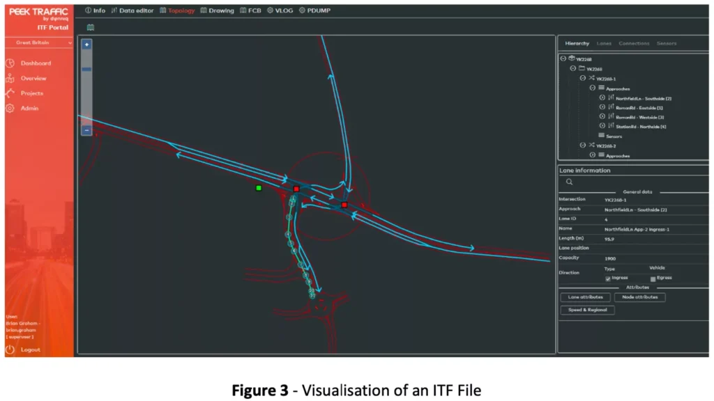 Each GLOSA site requires an Intersection Topology Format (ITF) file to define the locations, attributes and relationships of the lanes, signal groups and intersections at the site. The ITF files have been generated by Dynniq based on CAD drawings produced by the Council. The ITF files are only used within the GLOSA system after certification by appropriately qualified Council personnel.