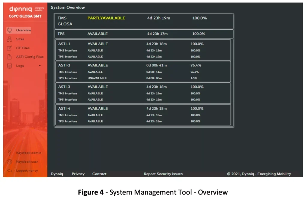 We had already produced the Advance Signal Time Information (ASTI) service to convert stage changes from our Urban Traffic Management System (Dynniq’s brand name is TMS) into SPaT messages for use by driverless pods; this was demonstrated as part of the on-road public CAPRI Mobility trials at Queen Elizabeth Olympic Park in March 2020. Dynniq’s cloud- based FlowSense and ‘Roadside’ ITS Station (RIS) instances had been developed previously and used for GreenFlow for Trucks, a GLOSA + priority app.
