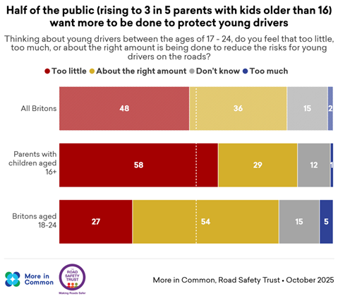 - 48 per cent think too little is being done to protect young drivers, rising to 58 per cent among parents with children over the age of 16.