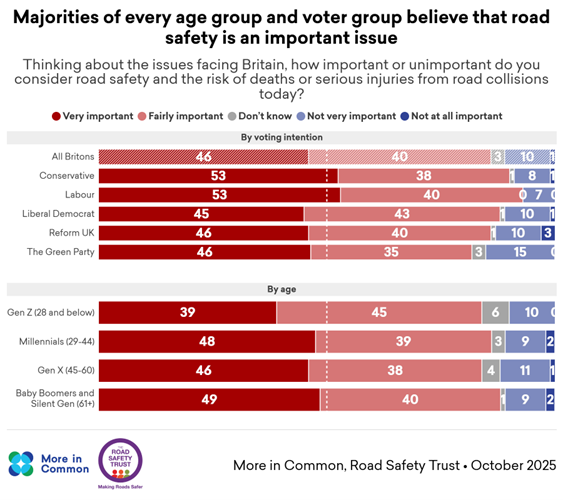 - 86 per cent of Britons say road safety is an important issue, spanning all ages and political groups.