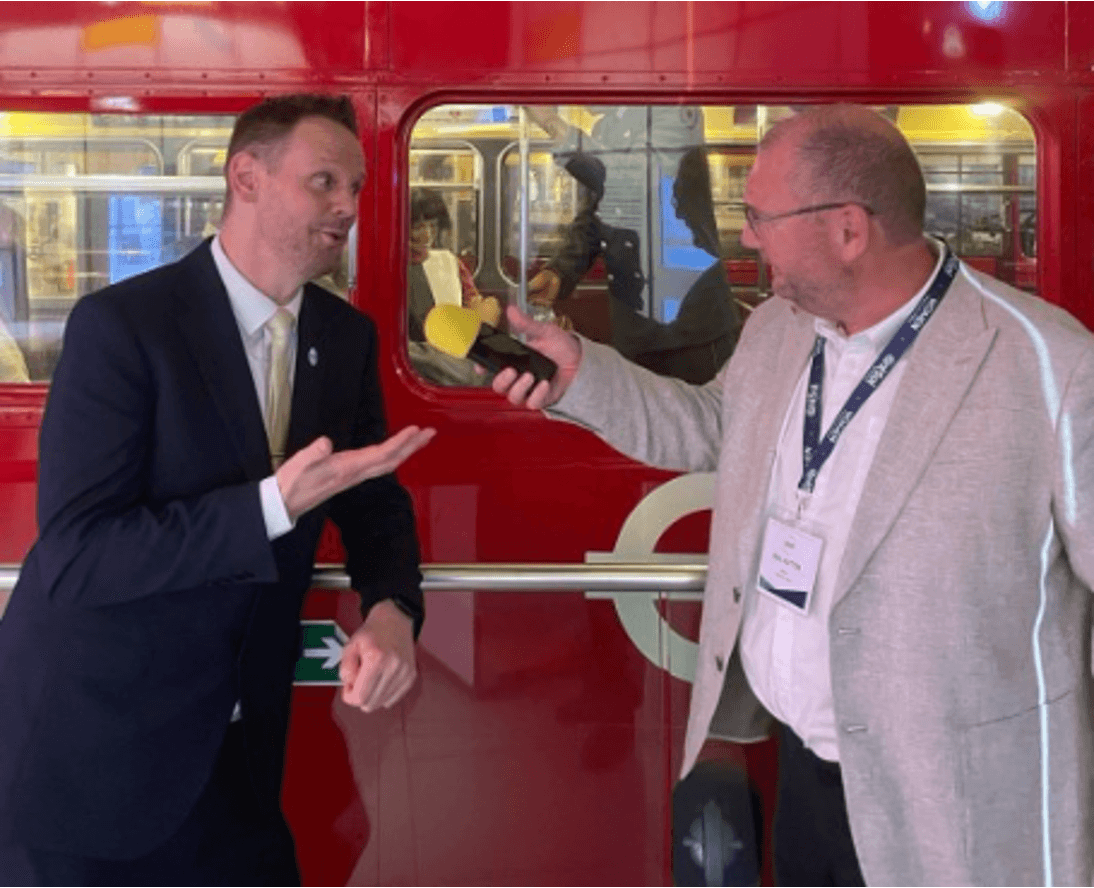 Simon Lightwood (pictured, left with podcast host Paul Hutton) is one of our guests on this week’s podcast recorded at a Women in Bus and Coach event at the London Transport Museum to celebrate Jill Viner, the capital’s first female bus driver.