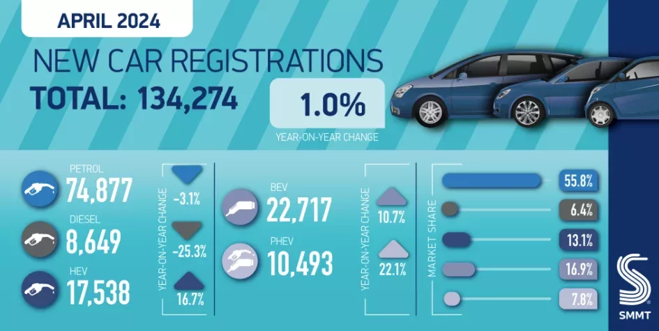 UK new car registrations grew for the 21st consecutive month in April, rising by a modest 1.0% to reach 134,274 units, according to the latest