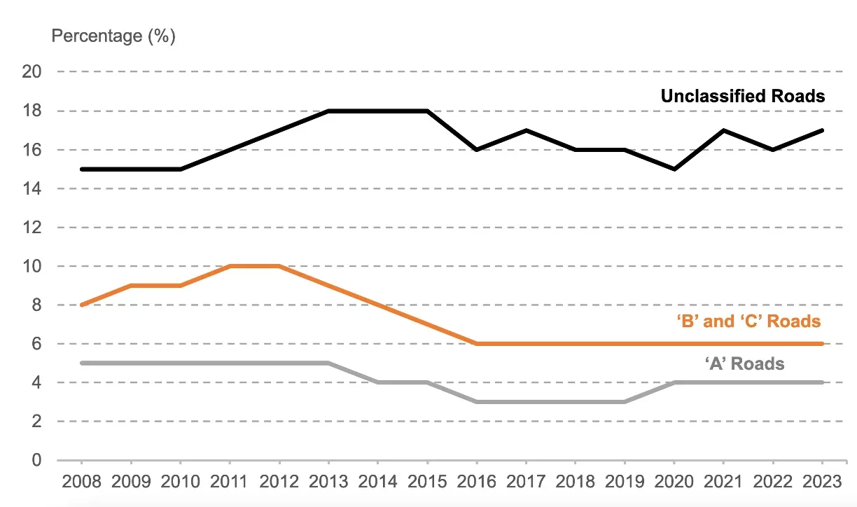 The condition of local roads continues to be broadly stable since 2016, particularly for classified roads. In 2023, the proportion of roads that should have