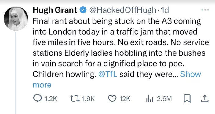 Actor Hugh Grant was among dozens of motorists who were stuck in heavy traffic on the A3 in South West London for up to five hours over the