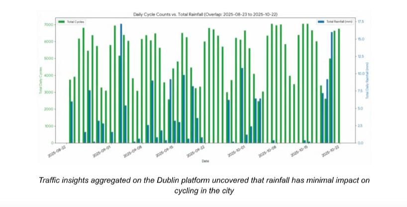 • Cycling resilience to weather: By combining VivaCity’s cycling counts with rainfall data, the platform showed that rainfall had a negligible impact on the number of cyclists on Dublin’s roads (insight from project synopsis). This challenges assumptions that bad weather deters active travel and strengthens the case for investing in cycling infrastructure.