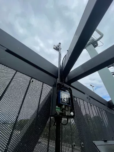 TRUGRD STREAM radar installation on a pole extender above gantry walkway with the NOVUS unit installed below. The radar is installed at an overall height of 9.7m from carriageway.
