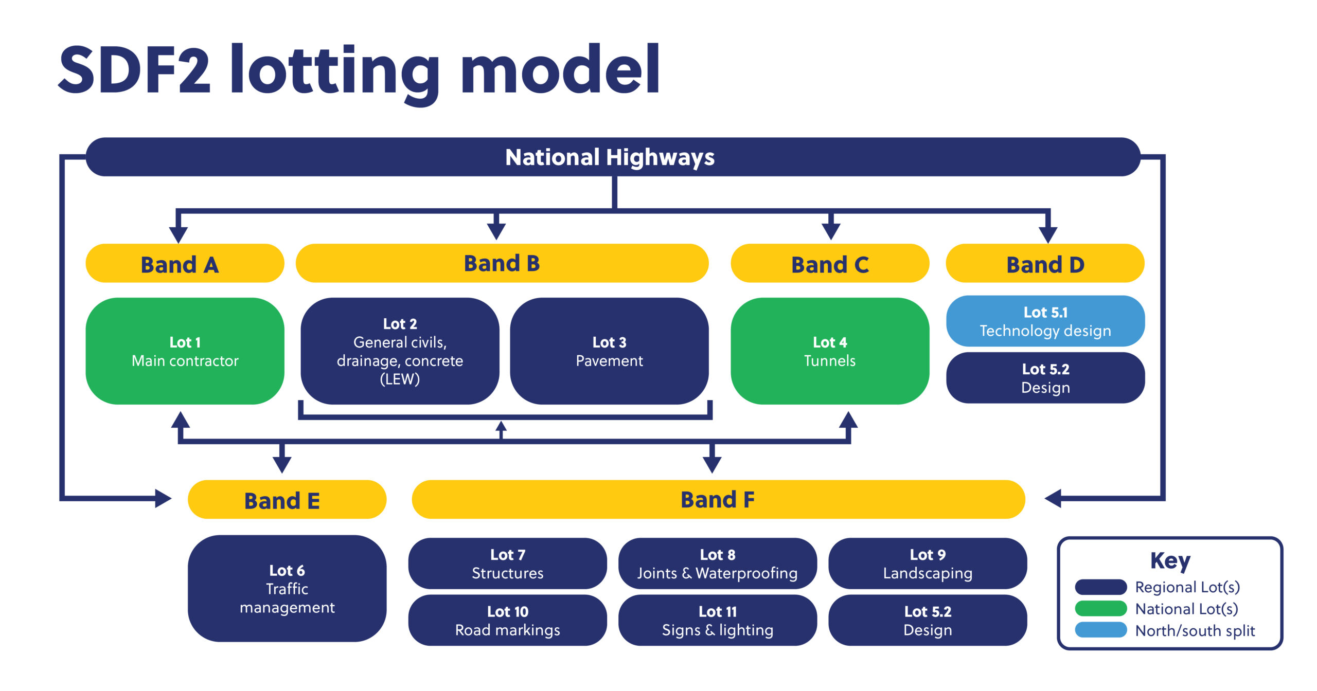 The lotting model is designed to give National Highways the flexibility to contract with band A or band B suppliers – or to contract directly with specialists on Band F.