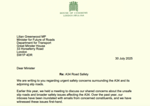 Olivia Bailey, MP for Reading West and Mid Berkshire, has been campaigning for safety improvements to the A34 slip roads at East Ilsley and Beedon, and has spoken about it in the House of Commons.