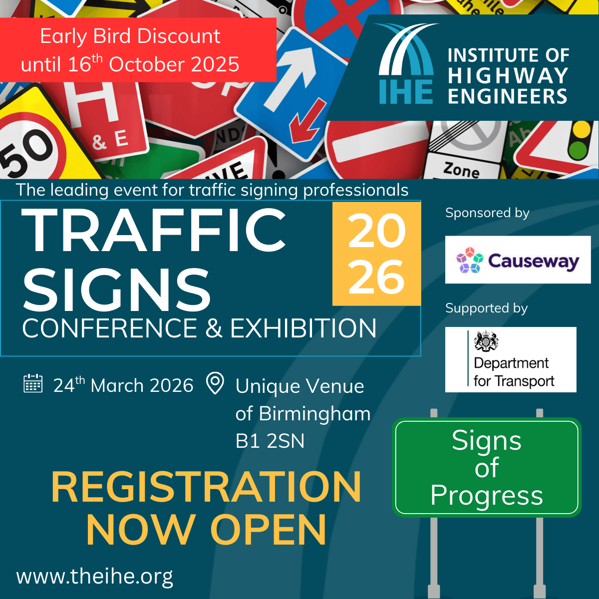 The Institute of Highway Engineers (IHE) is pleased to announce that its flagship Traffic Signs Conference will take place on Tuesday, 24 March 2026, in Birmingham. Supported by the Department for Transport (DfT) and sponsored by Causeway, the theme for this year is ‘Signs of Progress’.