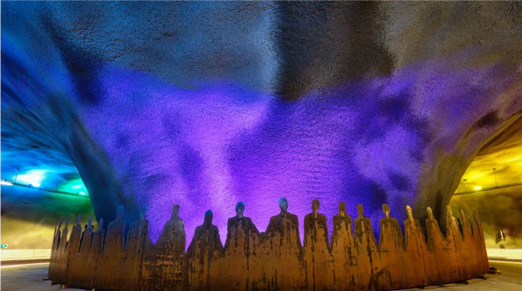 The roundabout contains artwork by Faroese artist Trondur Patursson, featuring sculptures and light effects.