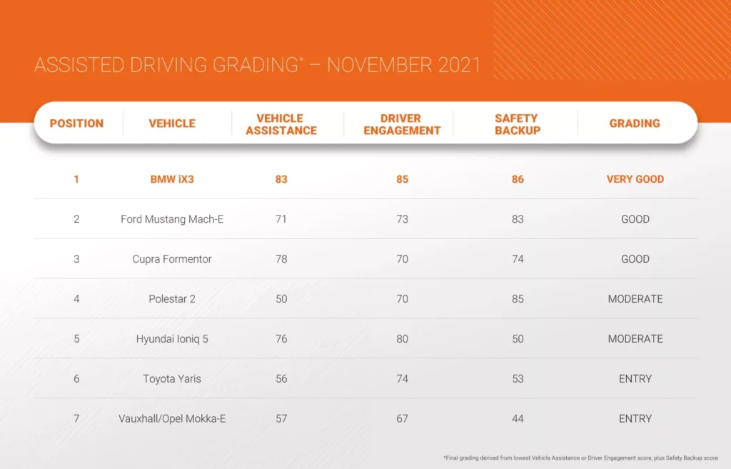 Each car was evaluated and rated for the level of assistance, level of driver engagement and effectiveness of the safety back-up offered by their Assisted Driving systems. The best systems strike a good balance between the amount of assistance provided and how much they do to ensure drivers are engaged and aware of their responsibilities behind the wheel.