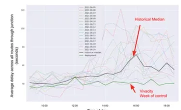 In order to gather significant performance data and to allow us to scale more effectively, our next development target was to improve the robustness of the system to allow us to leave the control pipeline running for long periods of time without the need for constant, human monitoring. In order to achieve this we developed a set of alerts to notify the users (Vivacity internal team initially) about any system or performance issues. We tuned the alerting parameters to adjust the agent configuration and the alert thresholds and build confidence in the completeness of the alerts. The key outcome is that we are currently running unmonitored, A/B testing at one junction in Manchester, Trinity Way – Great Ducie Street(x47), controlling from 7am to 7pm, and adapting automatically to changes in demand level and turning proportions (i.e. no need to timetable plans as in incumbent systems).