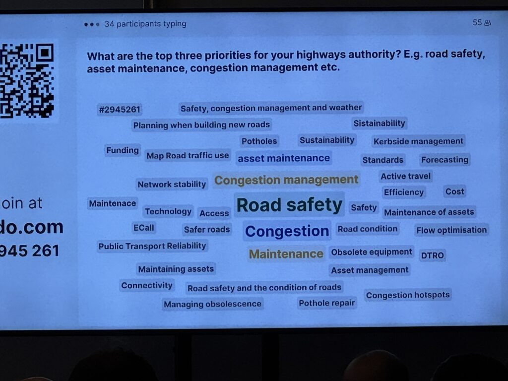 He then asks the audience, vial Slido, to give the top three priorities – eg road safety, asset maintenance, congestion management. The votes come in: