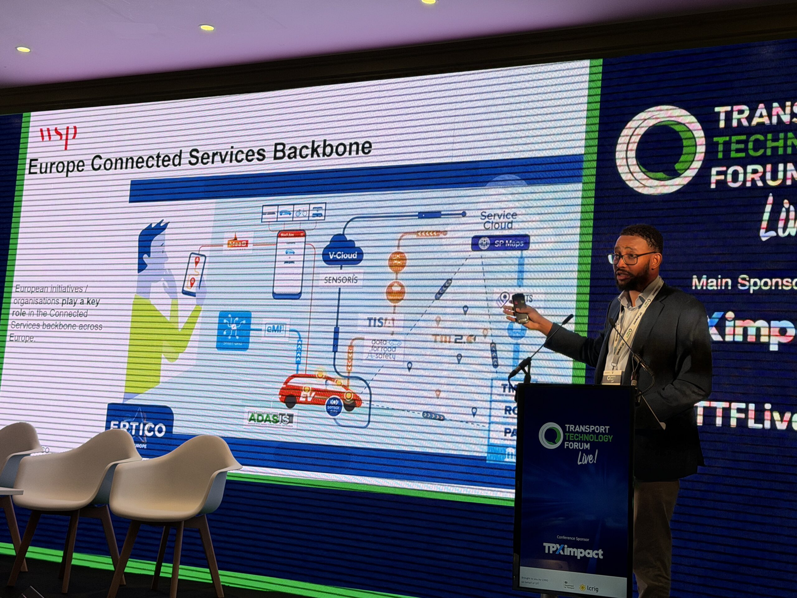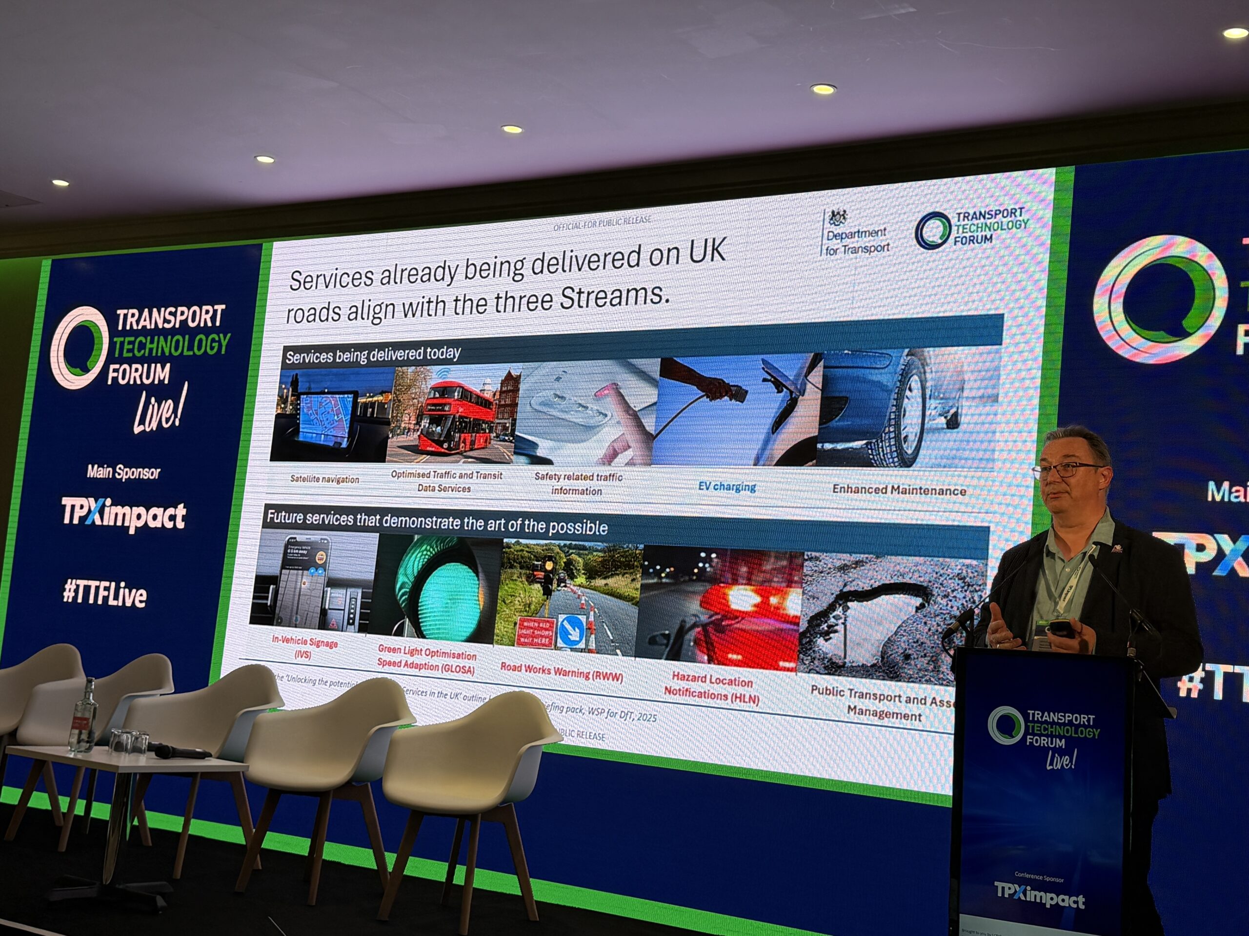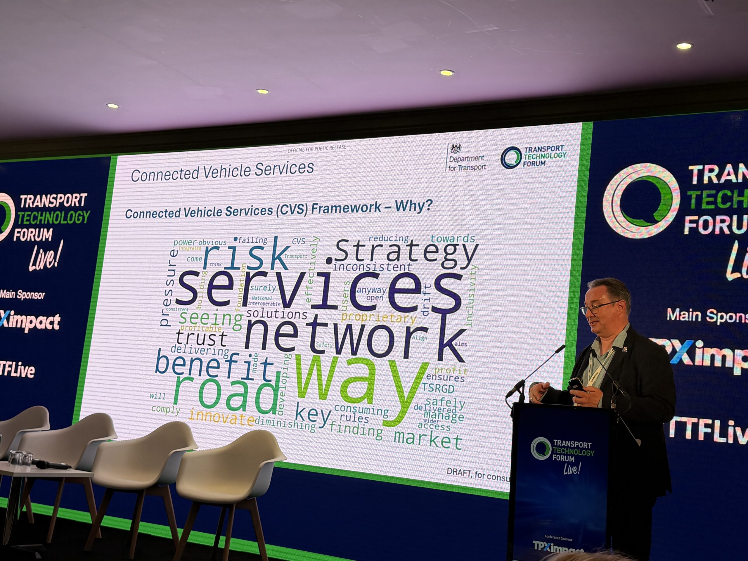 We’re back and Head of Road Infrastructure Technology at the DfT, Darren Capes, is talking about developing a set of deliverable connected vehicle services.