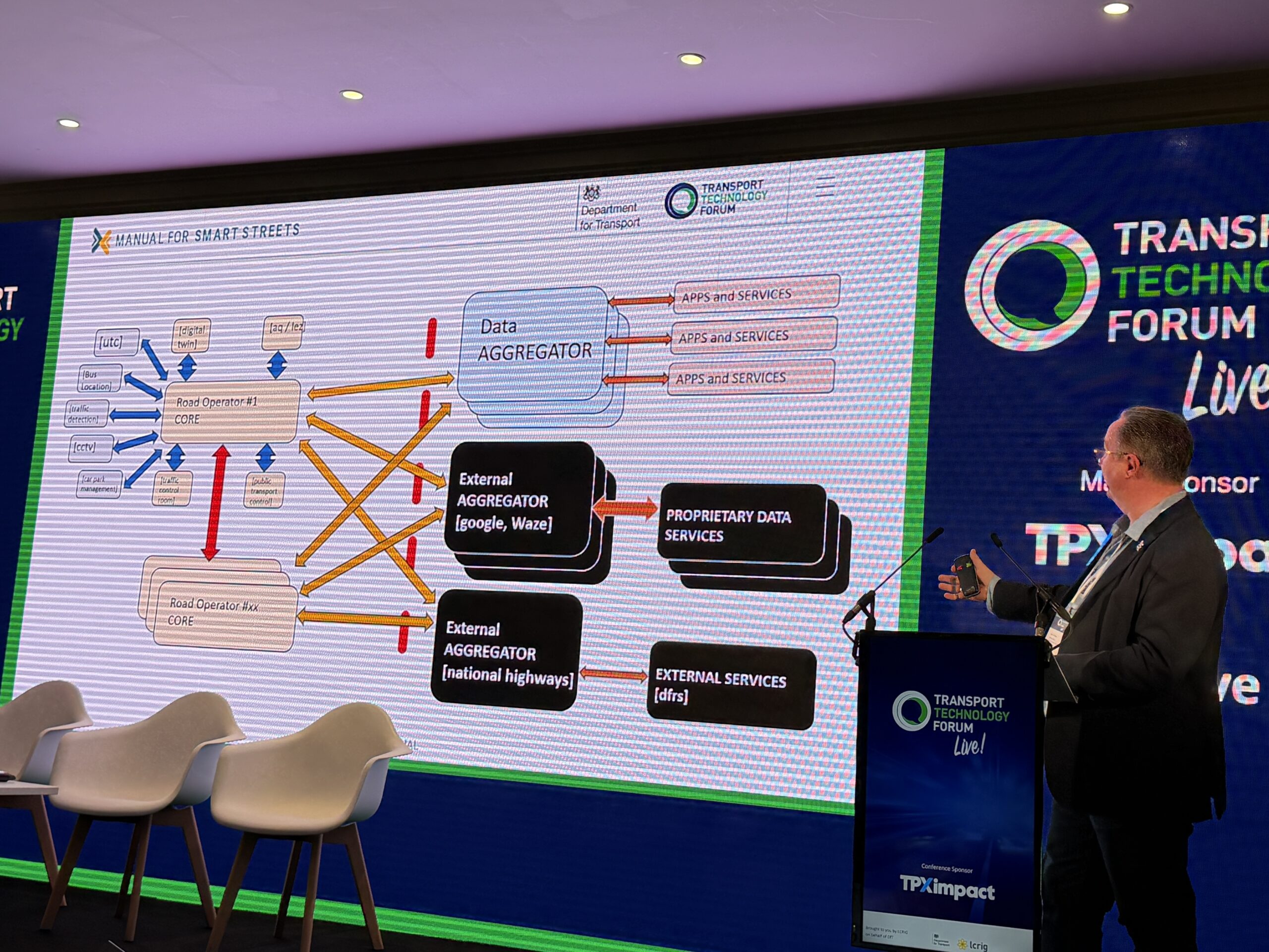 Next up, Darren Capes returns to the stage to talk about the Manual for Smart Streets. He says it is a really useful framework to provide guidance for adoption of technology, but he feels it has been under-used. “We now have a strong opportunity to do that,” he says, and he is rethinking the MfSS to turn it into a single point of guidance.
