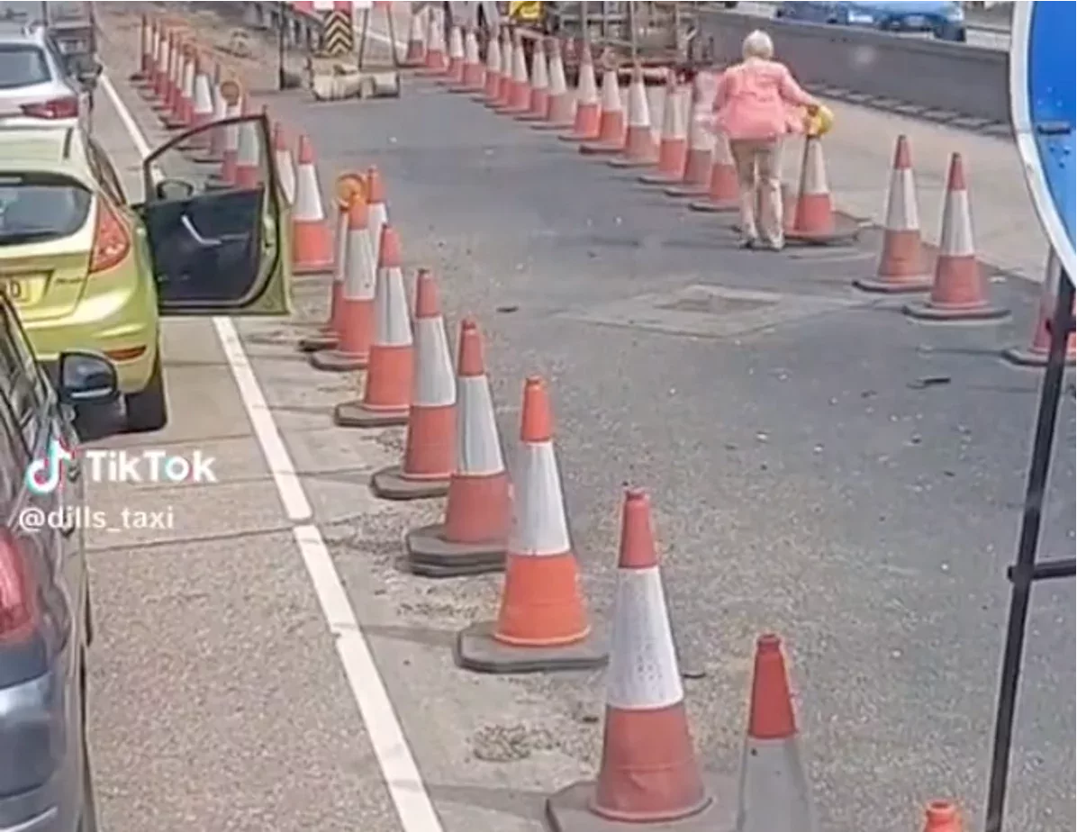 A video of a woman trying to drive through roadworks swap lanes in a queue of traffic on the A12 near Colchester in Essex is doing the rounds on social media.